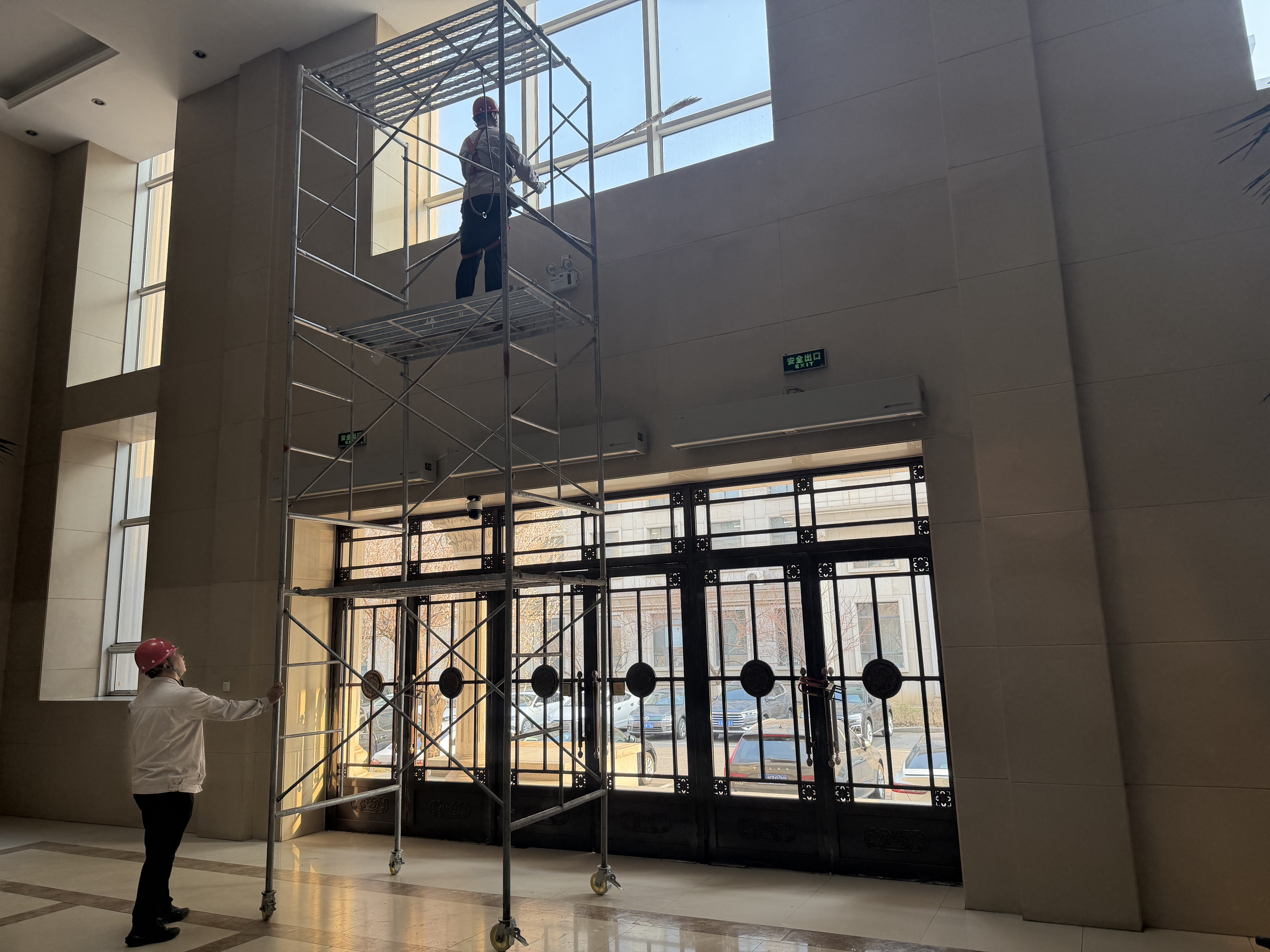 針對挑高墻面、高空玻璃等日常清潔難以覆蓋的區(qū)域,工作人員搭建移動腳手架,佩戴安全防護(hù)裝備,使用專業(yè)清潔工具對墻面污漬、玻璃浮塵進(jìn)行徹底清理。地面區(qū)域同步進(jìn)行深度拖洗、污漬清除,不放過任何衛(wèi)生死角,以細(xì)致入微的作業(yè)標(biāo)準(zhǔn)對公共區(qū)域進(jìn)行全方位“大掃除”。