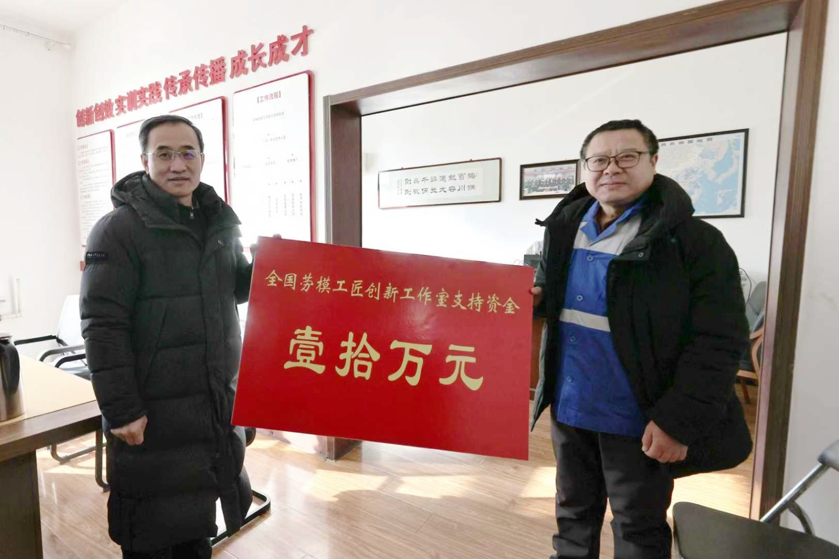 潘新宇實地察看了工作室的創(chuàng)新成果展示、技術(shù)攻關(guān)陣地等,認真聽取呂成剛關(guān)于工作室建設(shè)、技術(shù)研發(fā)、人才培養(yǎng)等方面的匯報,對工作室扎根冶金施工一線、聚焦機械設(shè)備與工藝管道安裝領(lǐng)域所取得的技術(shù)創(chuàng)新成果給予了高度評價,并將十萬元全國勞模工匠創(chuàng)新工作室支持資金交到呂成剛手中。